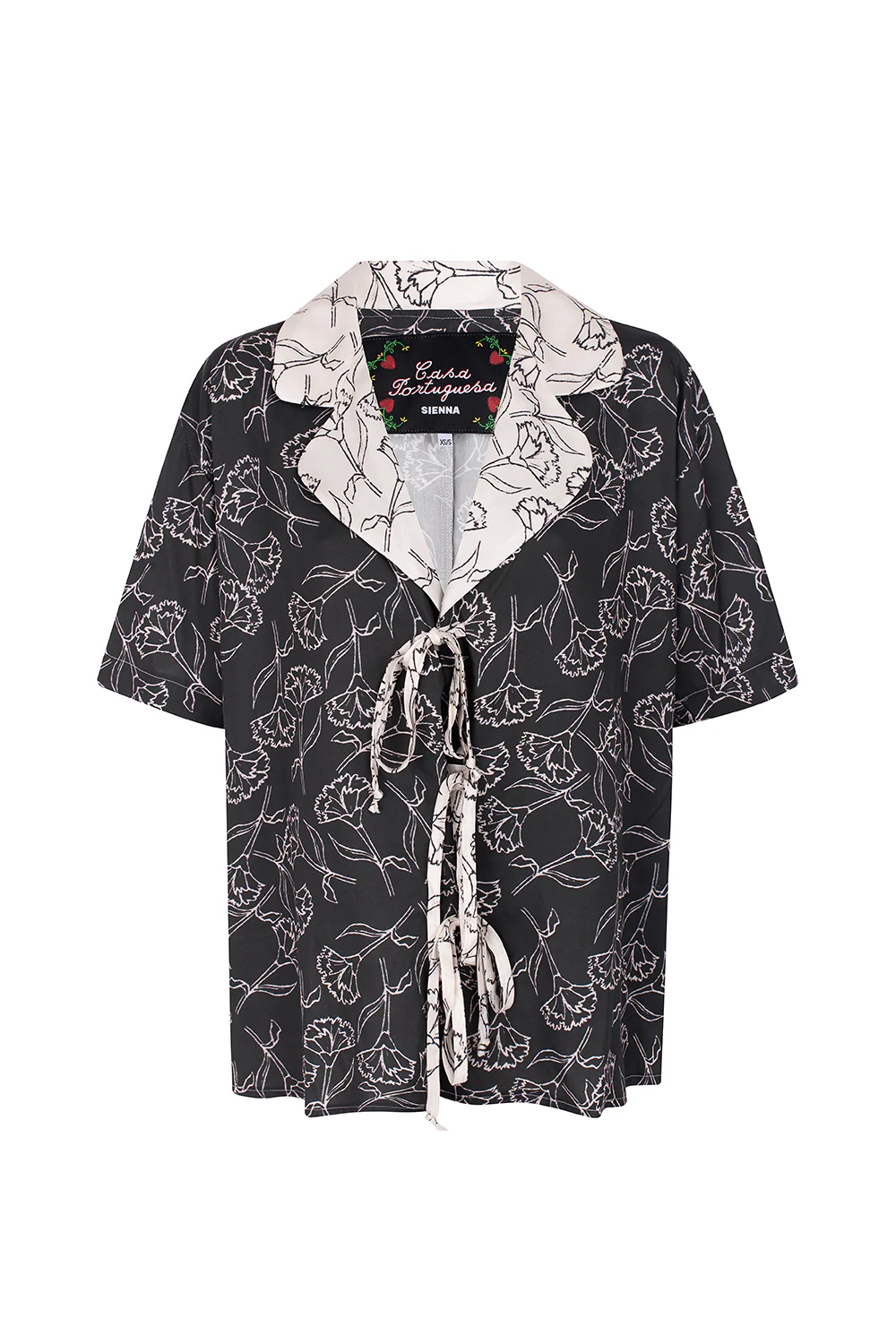 The ANTÓNIA shirt in BLACK CARNATIONS features a relaxed fit, collar, and front bows for a charming touch.