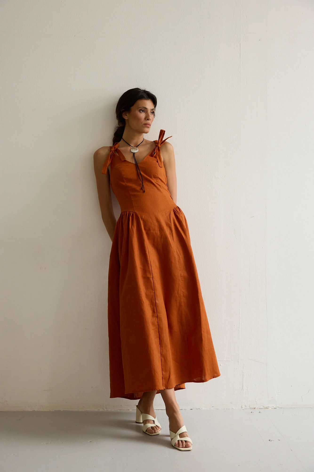 Expertly crafted, the DONNA TERRACOTA dress showcases a princess cut silhouette with charming tie straps and a "V" neckline.