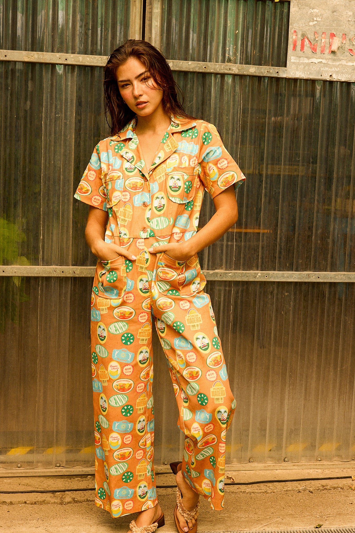 O padrão exclusivo apresenta símbolos icónicos da Ilha da Madeira, como o Cristiano Ronaldo, as bananas e a poncha, adicionando um toque de herança cultural a esta peça elegante. Perfeito para quem busca um jumpsuit distinto e com muita personalidade.